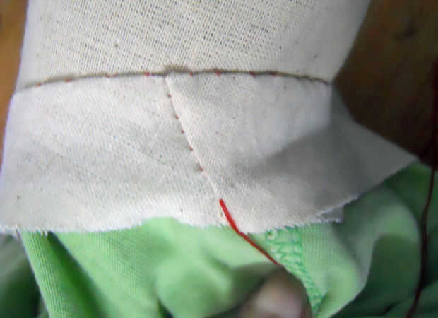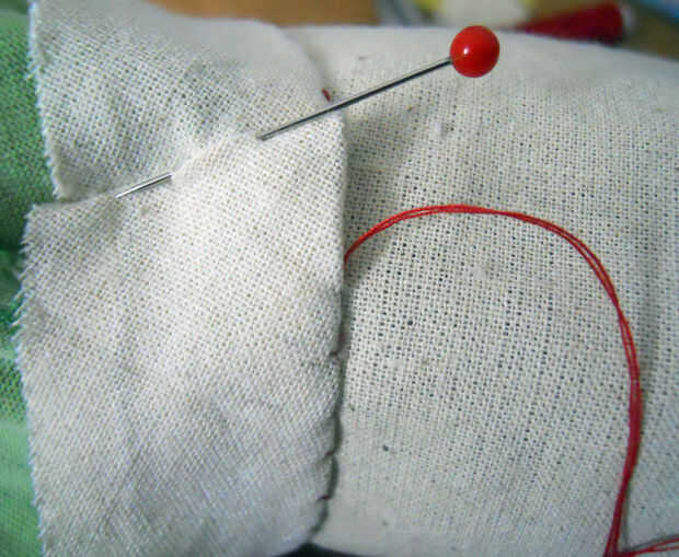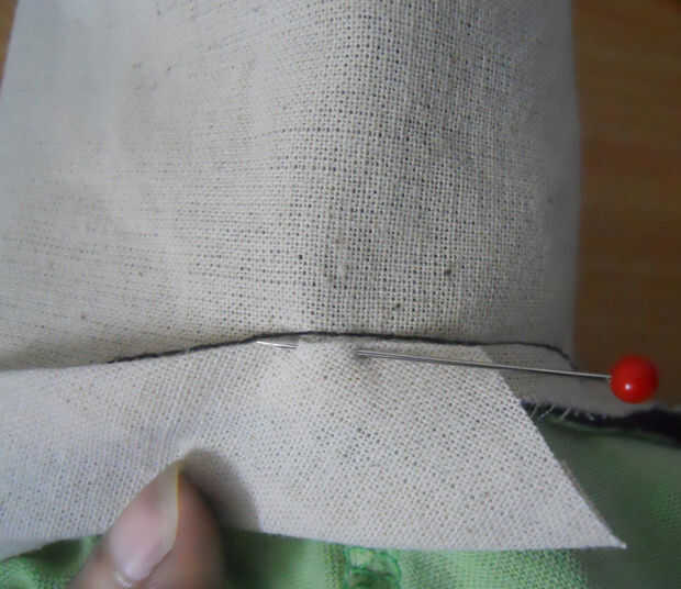 El dobladillo hasta casi llegar al final. Doblar el otro extremo para comprobar cuánta tela se requiere y recorte el exceso. Doblar los bordes de ambos como se muestra y acabado dobladillo en un lado.