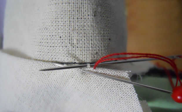 Inserte el hilo de dentro de la franja. Dependiendo del peso, tomar hilo de alrededor de 1 a 3 del paso de cuerpo de la aguja y el hilo a través de. Nuevamente introducir la aguja en la tira de que el hilo había salido anteriormente. Tire de la aguja después de tomar 1/4 pulgada de la tela. Repetir.