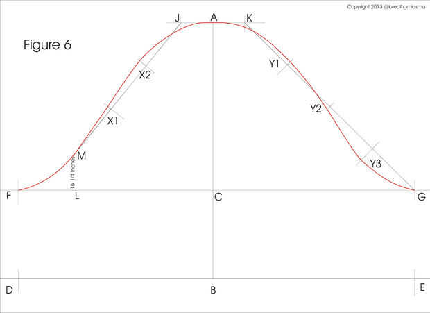2 - Únete A - G con una curva. La línea curva debe pasar también por los nuevos puntos en Y1, Y2 y Y3. En la figura; el arco se dibuja con color rojo. Asegúrese de que la curva es suave y agradable. Compruebe cómo la línea pasa en el punto (A).