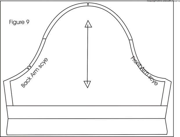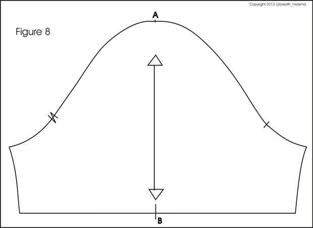Continúe con este patrón para hacer la manga pétalo lo contrario añadir margen de costura 1/4 pulgadas o 1/2 pulgadas en las curvas y alrededor de 2 pulgadas para el dobladillo. Marque todos los puntos de la muesca y trazar la línea de grano. (Consulte la figura 9)