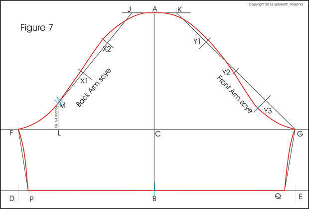 1 - en la marca de segmento (DE) (P) y (Q), donde PB = BQ = (manga redondo medida + facilidad) dividido por 2.