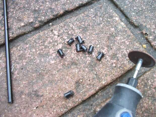 Tome el tubo que cubre el cable del equipo y retire el cable. Utilice el disco de corte de una amoladora Dremmel o ángulo para cortar pequeñas tiras de unos 4mm. Tendrá una longitud según la sección de tubo de cobre, así que 14 en total.