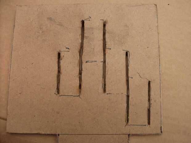 Salir de tus servos y colocarlos en el MDF. Les configuré de forma escalonada para evitar que los brazos de servo golpeando unos a otros. A diferencia de en las fotos anteriores también dejé un espacio horizontal entre los servos para dejar los cables se enganchen entre sí. Usé mi Dremmel, tijeras y un cuchillo para cortar los espacios donde se sientan los servos. Una vez que se corte un cuadrado alrededor de los espacios con un saliente rectangular para luego ser pegados al antebrazo.