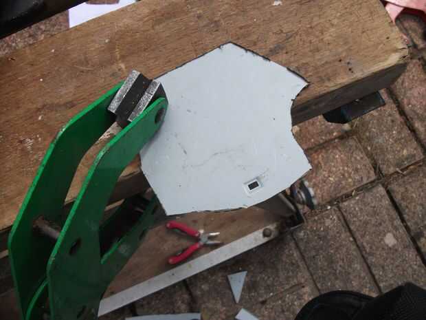 Cortar la palma y traza en un trozo de metal de hoja. He utilizado algunos acero de 2mm he encontrado, era la carcasa para un disco de PC. Otra vez usé la amoladora para cortar la forma (no se olvide su metal en lugar de la abrazadera primero).