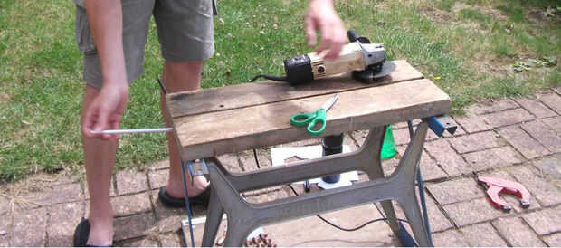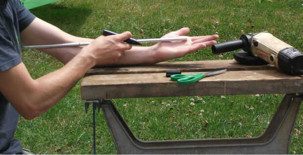 Medida desde el centro de su palma en su codo, se trata de la longitud de cada uno de los cinco tubos por cada dedo. Marcar la longitud de la pieza de aluminio y usar una amoladora o sierra para metales para cortar hacia fuera. Necesita una longitud del tubo para cada dígito, usé la mano hice cinco.