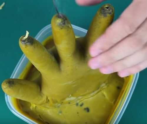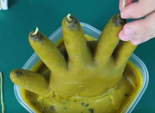 aquí es una manera aseada y divertida de hacer una mano de gloria de la noche misteriosa. O simplemente poner en la calabaza para un efecto extra espeluznante. Ahora la historia dice que una mano de gloria y me cita de wikipedia es una vela hecha de
