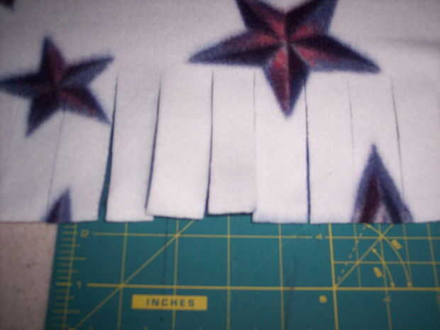 Siguiente cortar ranuras - casi como una franja - cerca de 3 pulgadas de profundo todo el camino alrededor de la tela. Sólo asegúrese de que usted corte lo suficientemente profundo para que usted puede atar los pedazos juntos. Si las aberturas son muy cortas, no podrás doble nudo les.