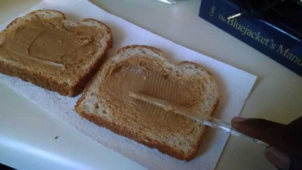 Utilizando el cuchillo extensión cantidad de mantequilla de maní en la cara que da para dos rebanadas de pan.