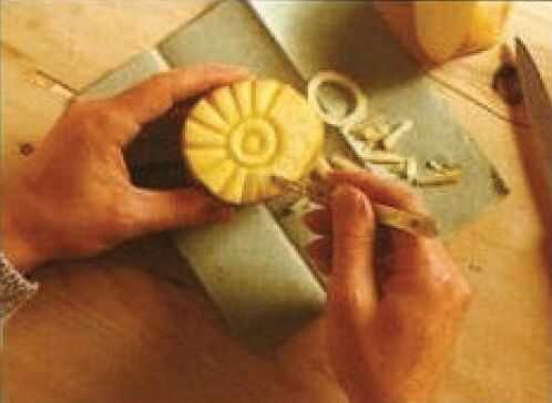 - Cortar una patata por la mitad con un cuchillo de cocina. Dibujar el motivo sobre la patata usando un rotulador de punta fino. Luego con un cuchillo, cortar el contorno, socava y sacar el fondo. Como sellos de Papa son de breve duración, mantener el seguimiento en caso de que usted necesita cortar otro sello.