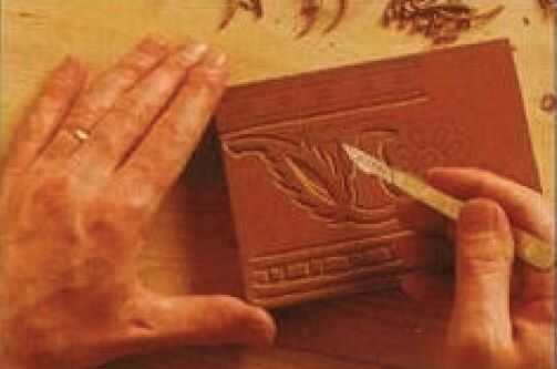 - Cortar el resto del patrón con lino (linóleo) herramientas: una pala para la eliminación de grandes áreas del fondo y un formón para cortar curvas más finas y detalles de patrón, pulsado el lino(linoleum) firmemente con la mano libre colocada con seguridad detrás de la mano de corte.
