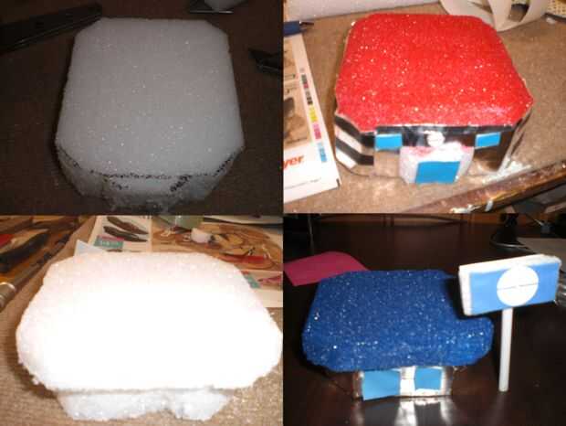 Básicamente, sólo seguí los mismos pasos que el centro Poke, pero con un diseño ligeramente diferente. El pequeño voladizo del techo es importante. La hace ver como en el juego. La diferencia clave es el signo. Para eso, corte un bloque de espuma de poliestireno en 2 pulgadas de ancho por 1 pulgada de alto por 0,5 pulgadas de espesor. Pegado una paja en él para el puesto y luego pegados en un pequeño cartel azul como el del juego.