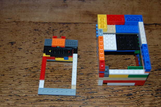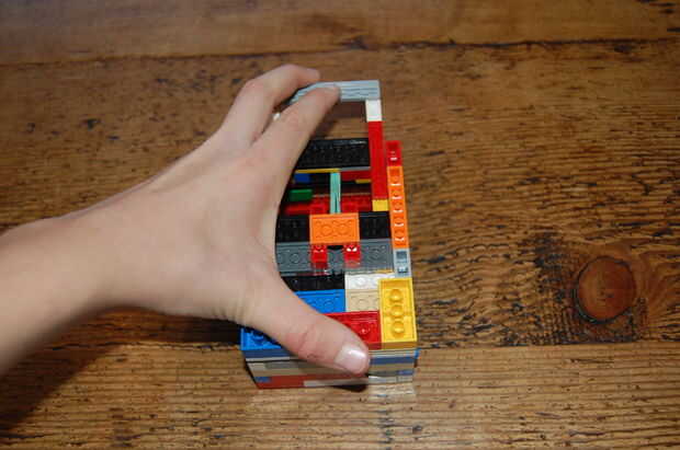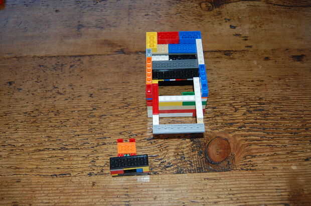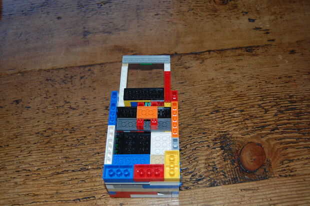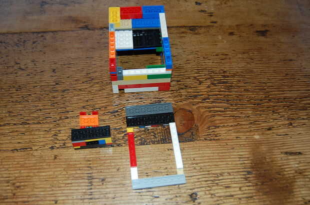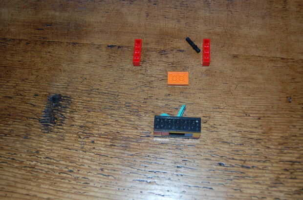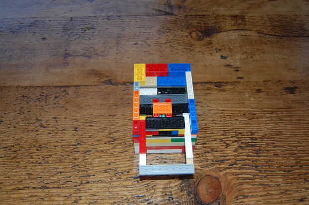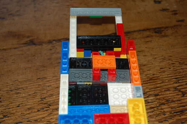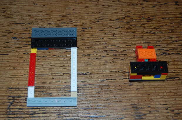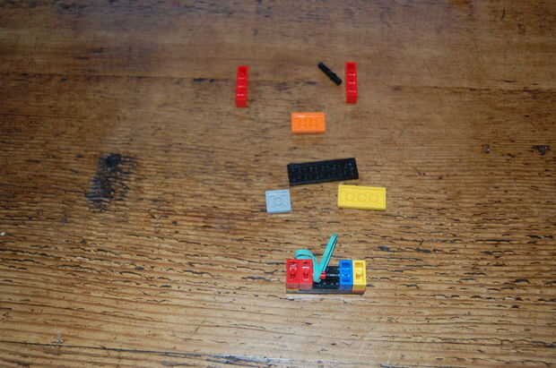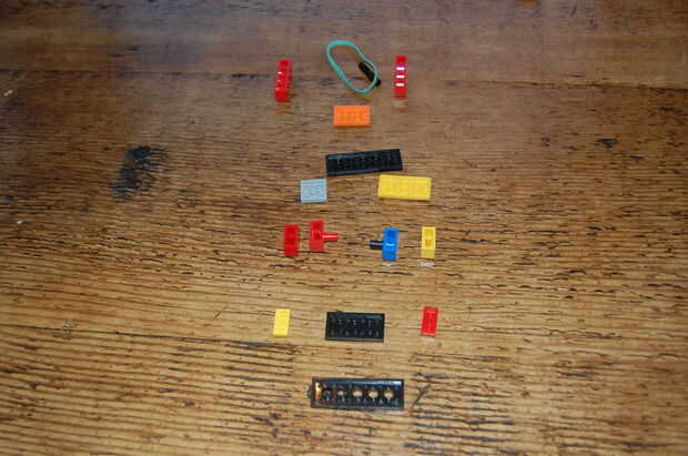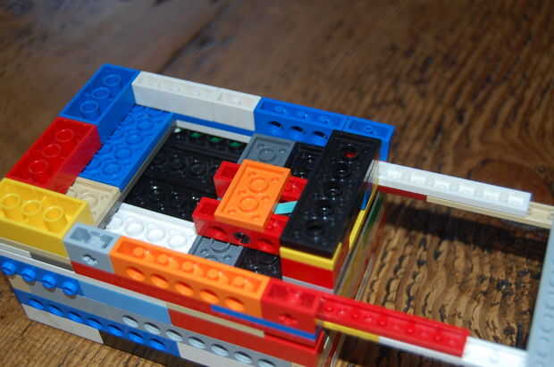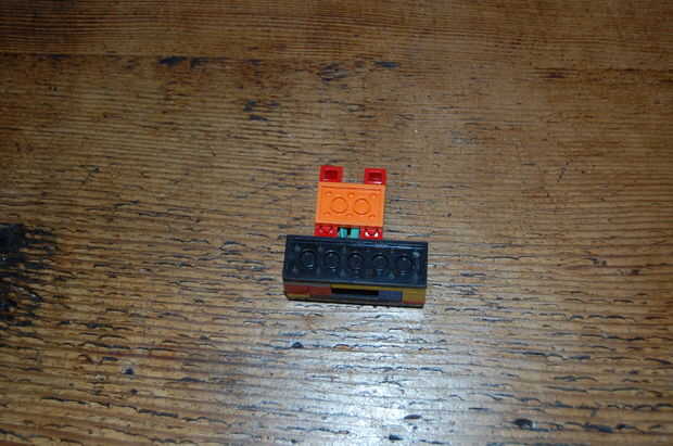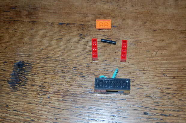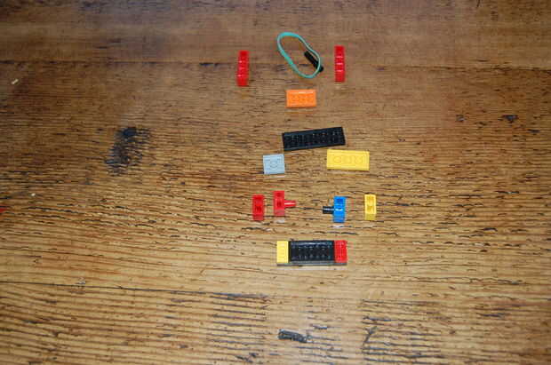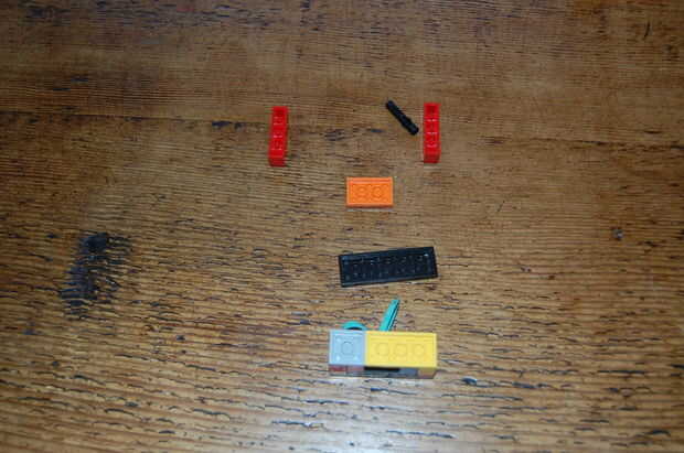 Parte 2: Esto es donde usted necesita su banda de caucho, piezas con agujeros en ellas y conectador de clavijas. Montar 2 piezas de 1 x 2 en un plano 6 x 2, para apoyar las piezas con la goma. A continuación montar las piezas de 1 x 2 con agujeros en ellas y tienen los pines del conector en ellos. También tienes que poner la goma en medio de ellos, pero dependiendo del tamaño de su banda de goma, se necesita doble o triple doblarlo. Asegúrese de que no puede salir antes de continuar. Coloque las piezas que están al lado de cada uno para apoyar a los otros. Después de hacer esto, colocar todo junto en la tapa con otra pieza plana de 6 x 2. Estirar la goma sobre a su pin de conector de lang y conectar la clavija del conector en los lados de 2 piezas de 4 x 1 con los agujeros en ellos. Poner un pice de 3 x 2 en la parte superior para asegurarla.