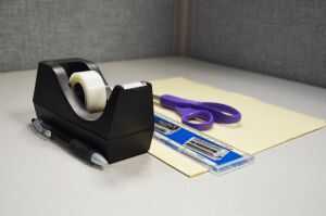Una carpeta de archivo, una regla, tijeras, cinta scotch y una pluma. Estos artículos se pueden encontrar fácilmente en las oficinas de negocios.