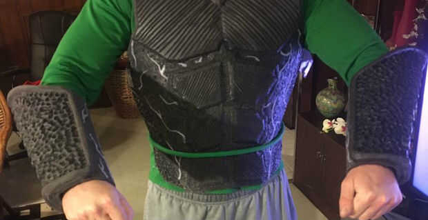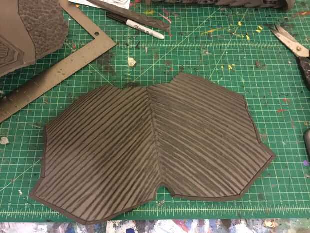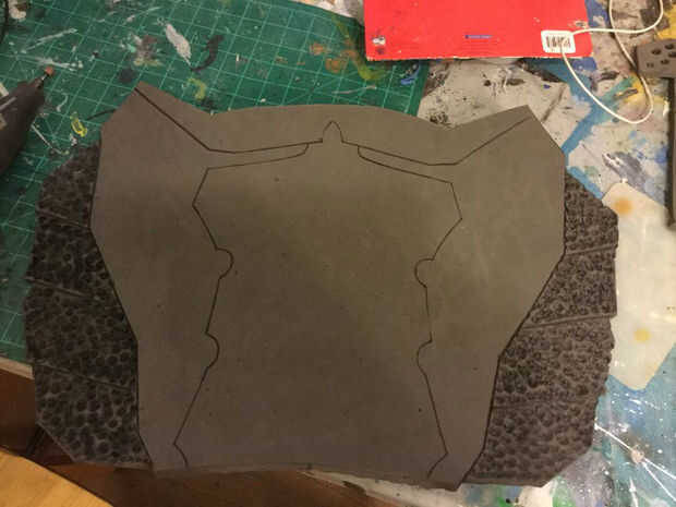 9. la transferencia a la espuma de EVA, recorte, dremel hacia abajo los bordes y poner en su textura. Opté por usar la textura recta ángulo para que coincida con el abs. También soldamos hacia abajo una línea entre los pectorales en la parte posterior de la espuma de EVA y pegué un poco abierta para crear una distinción entre la izquierda y derecha de los músculos pectorales (foto 10)