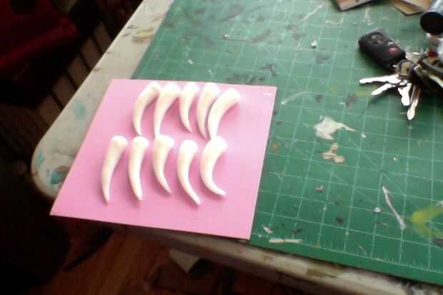 1) el collar puede tomar diversas formas. Fuimos con un todo el diseño del diente. Tomamos algunos termoplásticos (Foto 1) y había formado en los colmillos. Cuando esté fría, hemos perforado un agujero en la parte superior de cada diente