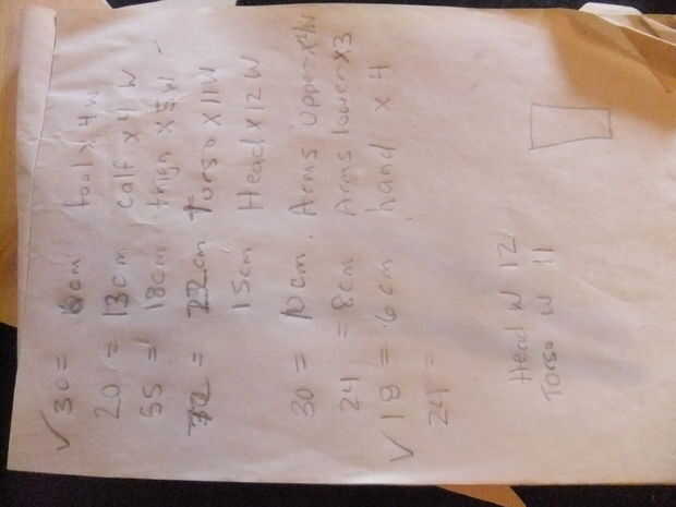 Empieza por tomar las medidas de su cuerpo (o alguien más no importa). Entonces la escala de sus medidas por aproximadamente 1/3, pero sólo un medio para la cabeza (me gusta la forma se ve). Recuerde que no tiene que ser exacta.