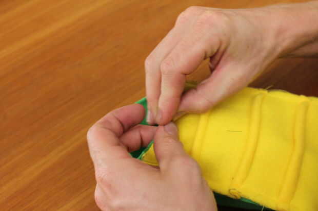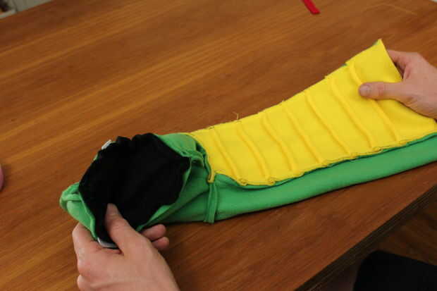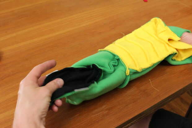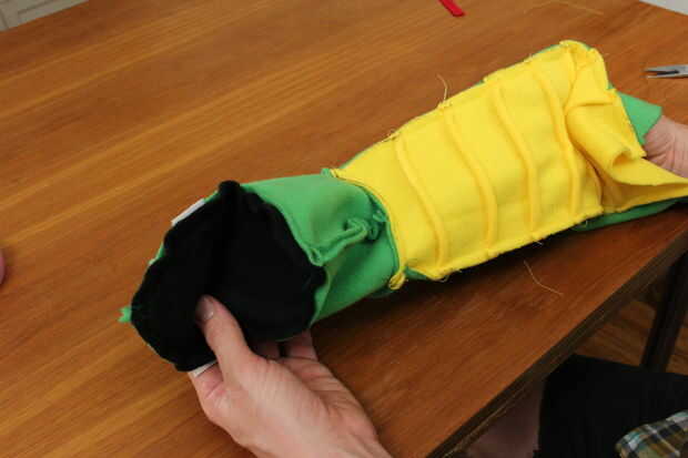 Una vez que se cose juntos puede llegar a dentro y sacar la cabeza fuera del cuerpo, desde adentro hacia afuera. Se realiza la costura. Pero no tu títere derecho-lado-hacia fuera sin embargo. Todavía tenemos más mientras que es al revés.