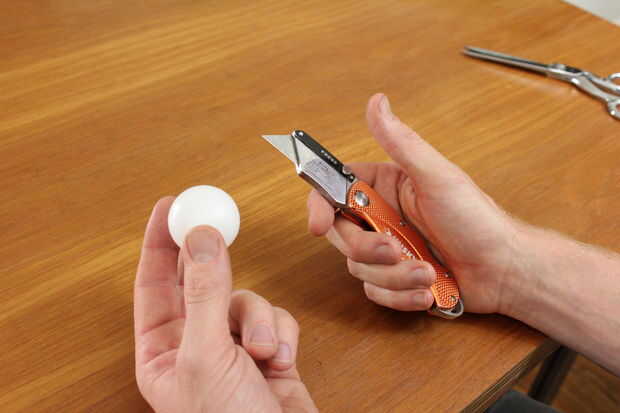 Luego aplica pegamento en el interior borde este esquema circular y rápidamente se adhirieron el mesa de ping pong pelota la mitad. Es importante mantener el pegamento dentro del círculo. Si alguna consigue fuera de usted será capaz de ver en tu títere que parecerá ojo mocos.