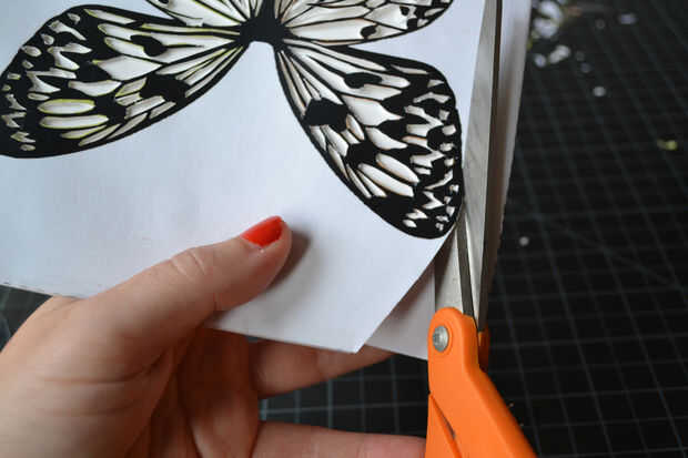 9. con un par de tijeras, corte alrededor del contorno de la mariposa. Tenga cuidado de no cortar los detalles que sólo recortar! Si usted necesita cortar más amplia que el contorno de la plantilla, está perfectamente bien.