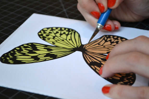 3. poner una hoja nueva en su cuchillo utiliy para cortes precisos. Sobre la superficie de lámina de corte, corte las secciones melocotónes de la mariposa. Tenga cuidado de donde pones los dedos durante este proceso, no queremos cualquier lesión! Si el papel se desliza alrededor demasiado para su gusto, cinta adhesiva a la almohadilla de corte.