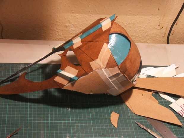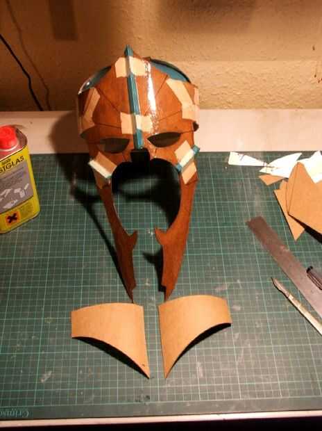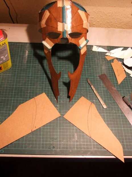 A continuación, marcado y corte las secciones de la papada de dos lados. Estas fueron pegadas en su lugar y recortadas sobre las orejas para caber. Seguí prueba montaje cuando fui hasta el ajuste cómodo. Luego dio los paneles laterales de un interior y una capa exterior de resina y a la izquierda él para curar.