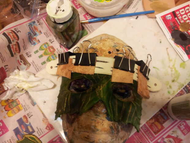 Aplicar la soldadura de cuero en la parte superior de la máscara sobre los ojos. Centro de la franja de cuero en la zona que fue aplicado el pegamento. Utilice los ganchos de la carpeta para asegurar la correa de cuero en su lugar mientras se seca. Coloque pequeños trozos de cuero de desecho debajo de las pinzas como haces esto, porque los clips de lo contrario podrían dejar indentaciones en el cuero.
