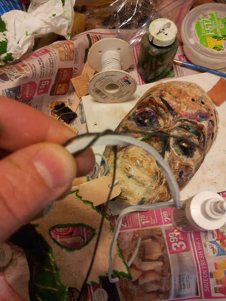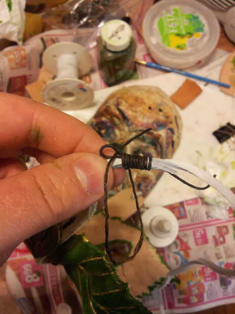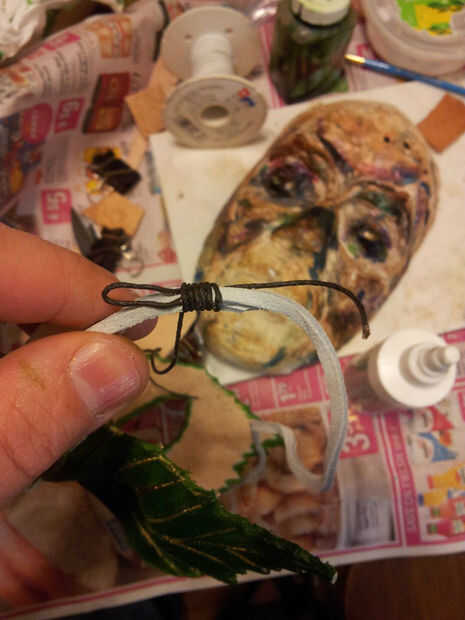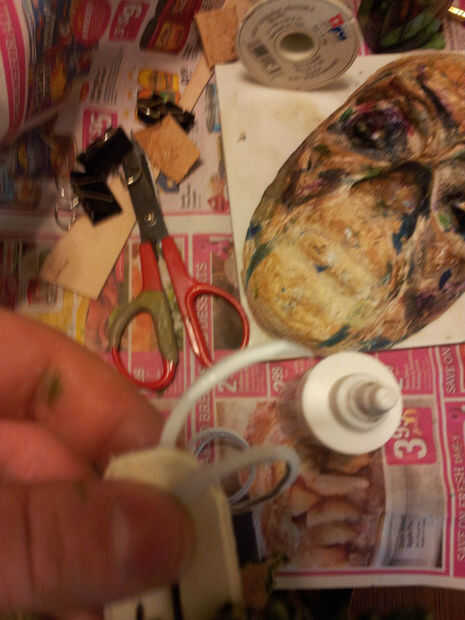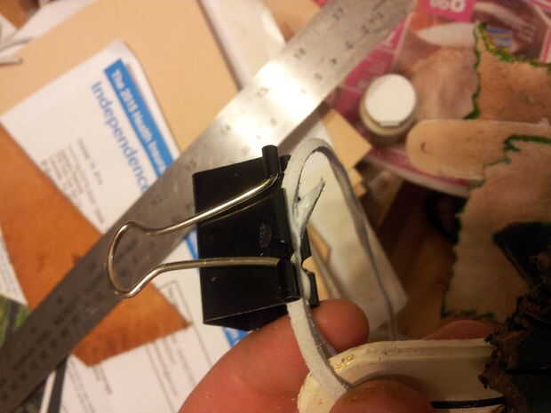 Poner pegamento en el extremo corto y sujete con el clip de la carpeta para que se forma de bucle que se ejecuta a través de los agujeros.