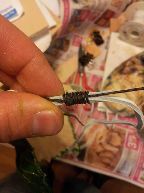 Tomar el otro extremo del hilo y enróllelo alrededor el lazo del hilo de rosca y los unieron trozos de cuero. Iniciar en la parte inferior del bucle y enrolle hacia arriba. Envuelva bien.