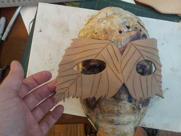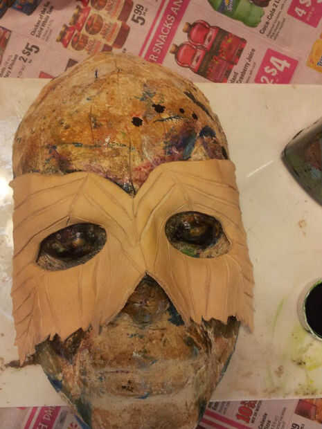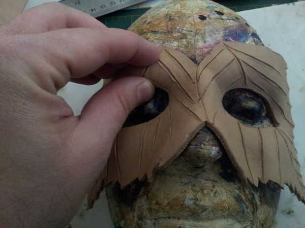 Coloque la parte de la cara todavía empapados sobre el molde de la cara. Asegúrese de que la línea de ojos hacia arriba con los agujeros cortados.