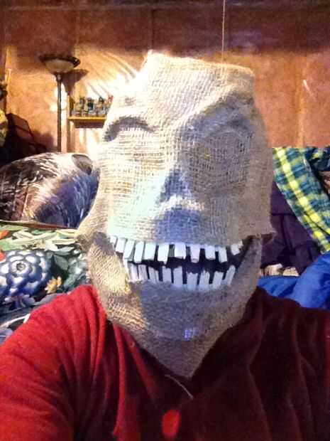 Caliente los bordes pegamento y empezar a formar la arpillera sobre todo, tenga especial cuidado con la cara y simplemente tire hacia atrás el exceso y pegamento a sí mismo para que sea más estricta. La arpillera que utiliza realmente pude ver por muy bien que era agradable.