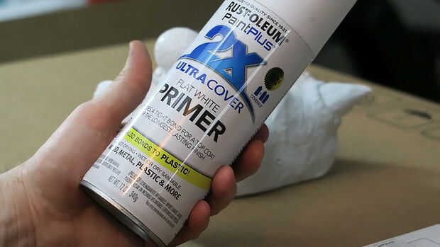 Usar pintura en aerosol para añadir una capa base de color a la mascarilla. Te recomiendo empezar con una imprimación blanca para ayudar a su memoria de pintura mejor a la superficie de la máscara.