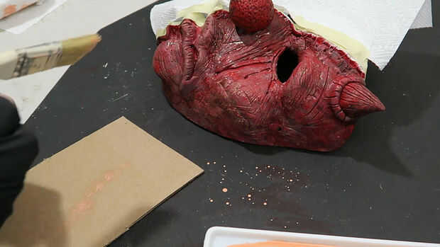 - Tome los dedos y tire hacia atrás de las cerdas haciendo que se mueva hacia adelante y gotas de pintura de aerosol en la mascarilla.