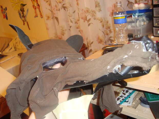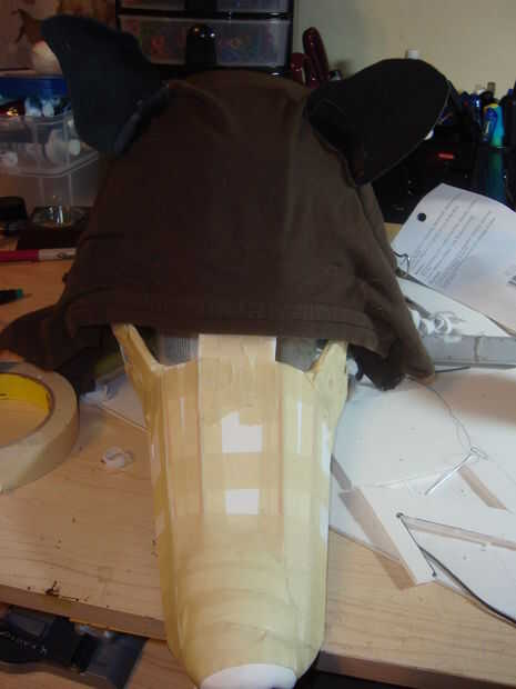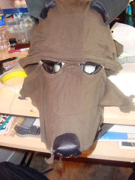 8: Tire a la tela hacia arriba y deje que se cuelgue en determinados puntos en el hocico a su lobo un gruñido. (Foto 7) Recorte a cualquier tejido innecesario, pero asegúrese de dejarlo colgando debajo de los ojos.
