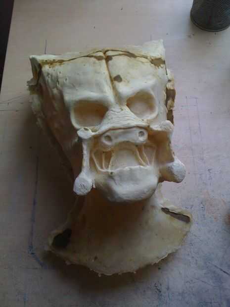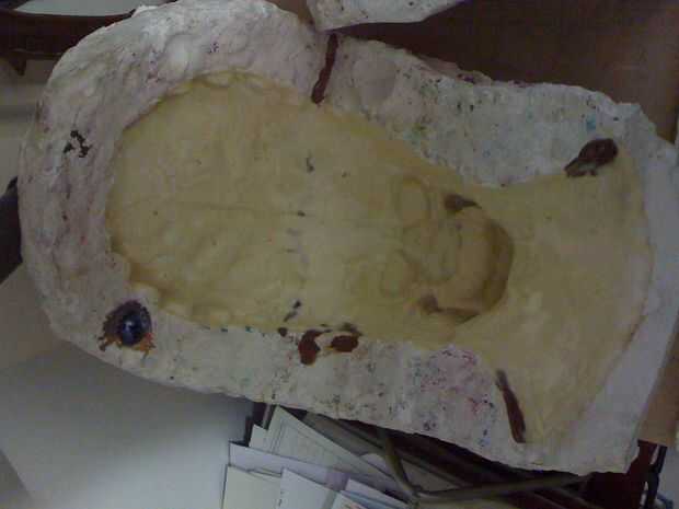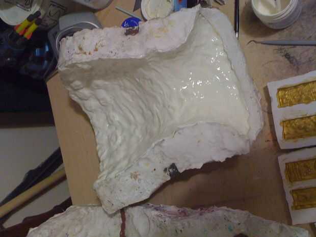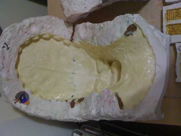 Ambas secciones del molde con una capa de látex espesado asegurándose de que se trabaja en todos los detalles de la pintura. que este sistema y luego hacer 3 o 4 veces más hacerlo espeso lo suficiente. asegurándose de que pintar sobre los bordes ligeramente y poner las 2 mitades junto con látex entre ellos.