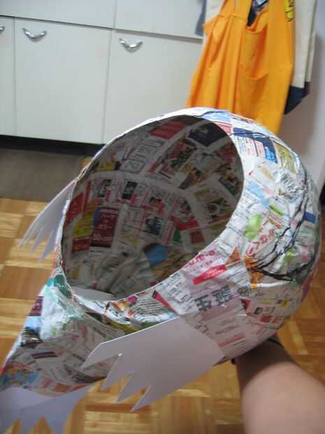 Una forma de comprobar es sostener la cabeza hasta una luz, o poner una linterna en el interior y buscar los puntos de luz. Hice el maché aproximadamente un 1/8 de una pulgada (2-3mm) de espesor.