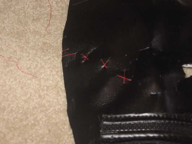 hice unas puntadas en el ojo que le falta era con hilo rojo. Lo hice por tres líneas con el hilo, y luego conseguir otra pieza y con tres más líneas cruzando la primera líneas. Terminó por no mirar demasiado bien, pero por lo menos llenada en el espacio vacío.