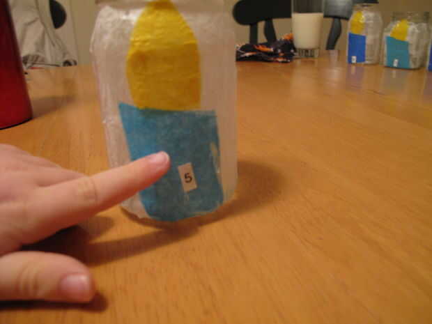 Este es un paso opcional, pero pensé que ya me estaba haciendo la menorá especial para mi hija como bien podría ser un momento de aprendizaje. Quería mostrarle que hay 8 velas por las 8 noches de Janucá y que son colocados en la menorá de derecha a izquierda pero iluminadas de izquierda a derecha. Habilidades de motor finas de mi hija tiene un buen entrenamiento colocando las etiquetas en los tarros.