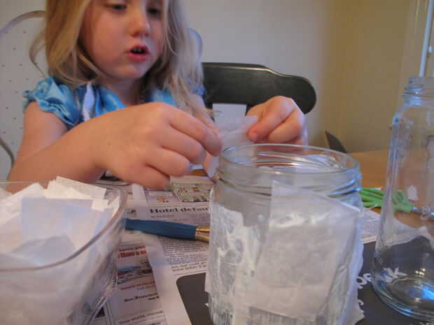 Usar los cuadrados y los rectángulos cortes de papel de seda blanco para cubrir la jarra, pegado a la capa de Mod Podge que cepillado sólo en. Se superponen las formas que se asegure que hay leerlo fuera de vidrio.