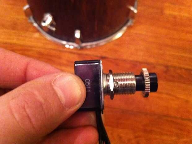 Tambores tienen un pequeño agujero en el lado llamado un agujero de aire. Yo esperaba el orificio de aire acomodaría mi interruptor, pero era un pelo demasiado pequeño. Encontré una broca ligeramente más grande que mi switch, pero menor que la tuerca del interruptor y utilizado para agrandar el agujero de aire.