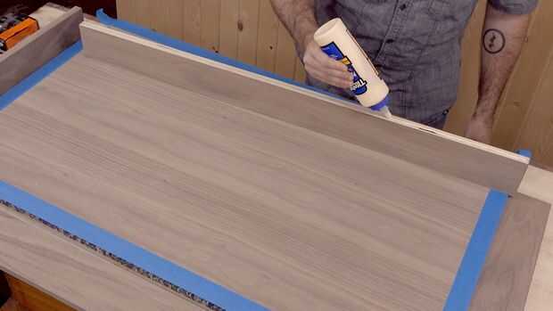 En la parte superior usaremos cinta de pintor para marcar el recuadro. Esto también protegerá la madera del pegamento apretón hacia fuera. Luego a agregar pegamento a la parte inferior de las piezas y establecer en su lugar usando la cinta azul como referencia.