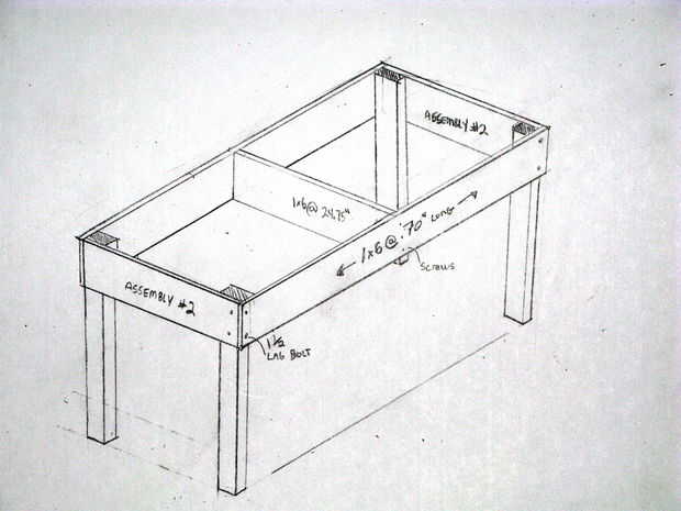 Tomar de conjunto de las patas y soporte para arriba en el lado y pone 1 X 6 en la parte superior. Hacer que todo esté alineado y cuadrados, taladre y atornille pernos en ambos lados. Voltee la base y repetir. Soporte una vez completo la tabla encima de la derecha. Lugar 1 X 6 pasado 24,75" pieza en el centro de la mesa, cuadrado y asegúrese de que está centrada en la base para permitir que la parte superior encajar correctamente. Taladre y atornille.
