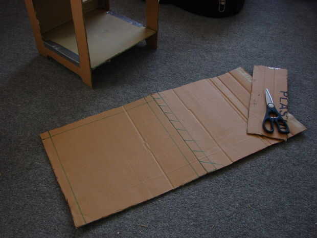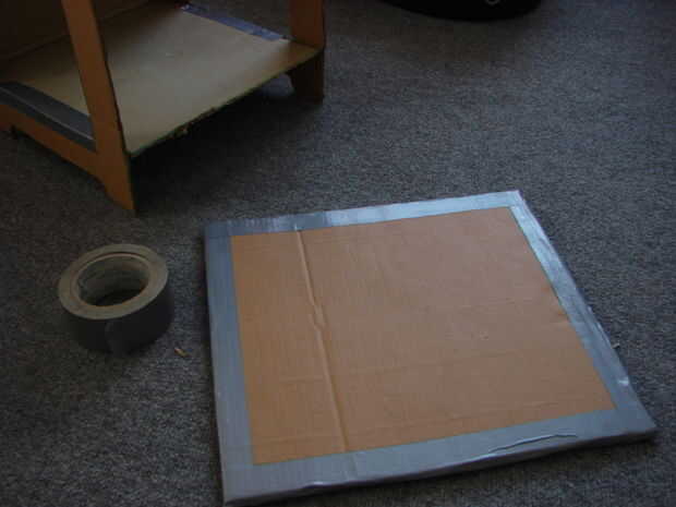 Uso de piezas adicionales de la tarjeta, construir la mesa de lado. Inicialmente utiliza dos capas de tarjeta con cinta juntos, pero luego decidió añadir una tercera fuerza. Conecte a la base con cinta adhesiva alrededor de los bordes (la parte posterior de la parte superior debe quedar al ras con la base).