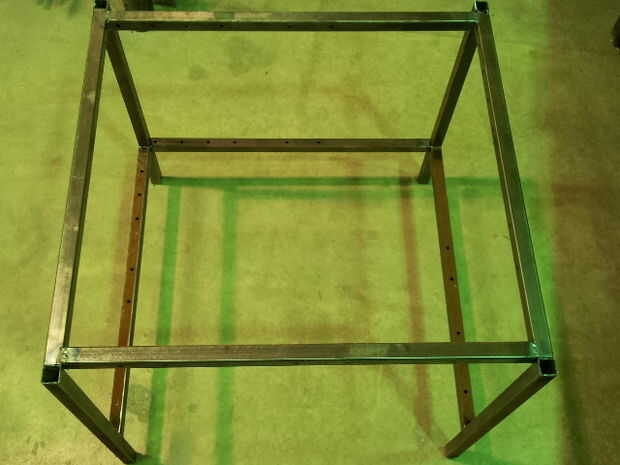 Aquí, vemos el primer vistazo de lo que será el producto final. Todas las piezas del marco han sido soldadas con autógena juntas y el marco está listo para cualquier cosa que se puede lanzar en él. Garantizando que todas mis soldaduras penetraron el metal y Unidos para todo puedo estar seguro que el peso del corte de las placas de acero en la parte superior no causará la estructura falle. Se trata de una pieza muy importante de todo el proyecto. El éxito o fracaso así como el potencial para lesión todo se basa en la integridad de esta estructura.