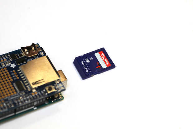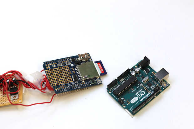1. Conecte la pantalla de registro de datos sobre Arduino e Inserte la tarjeta SD