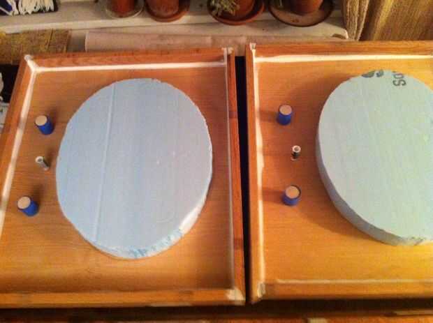Usé algunos valores de espiga con cinta en la para los agujeros del grifo, una cáscara de palo de pegamento loco para el agujero del tapón y poco he encontrado en la calle de una muestra de la galería de espuma. Cortar la espuma con un clip, yo seguí calentar sobre el fuego. Estos molde se puede hacer más precisamente, sin embargo va en este i sabía que los labios de mi hardware de fregadero de baño fueron perdonar lo suficiente para cubrir todos los bordes ásperos.