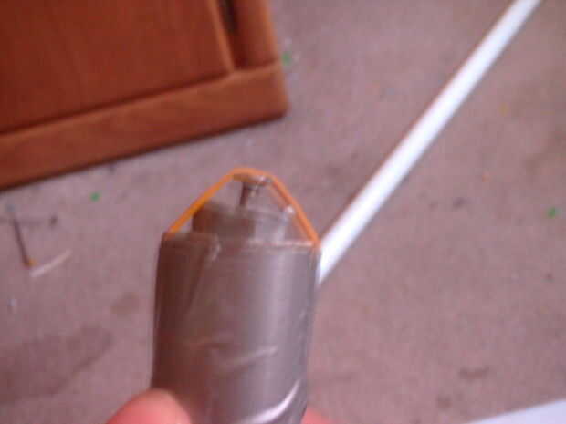 luego poner la chincheta (tornillo o clavo) y ponlo extremo puntiagudo hacia abajo sobre el co2, bajar la goma elástica y cinta en el otro lado de pvc.