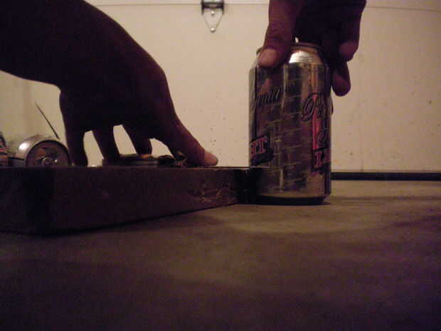 poner el cuchillo en su pedazo de madera y en el lado de la hoja hace el lado de la lata tocar el cuchillo y girar a la lata por lo menos 1 vuelta con ligera presión contra el cuchillo.