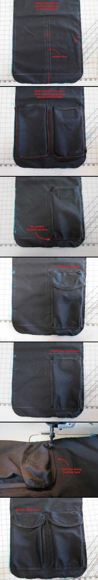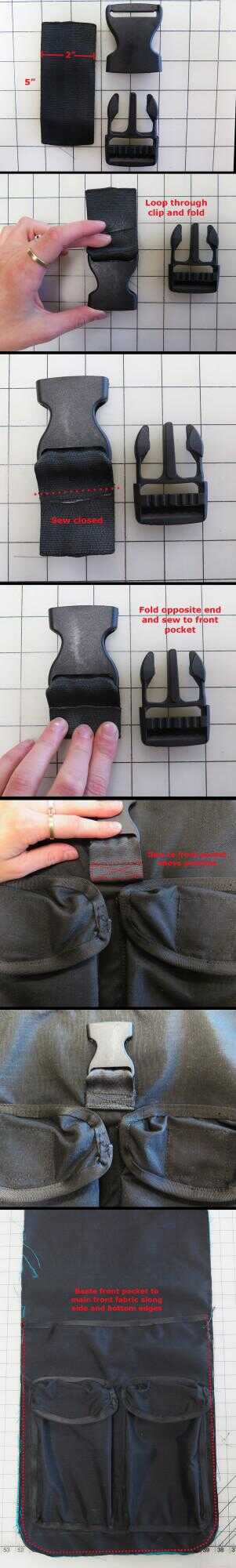 Este paso cubre montar las bolsas delanteras y clip inferior a la tela del bolsillo delantero.