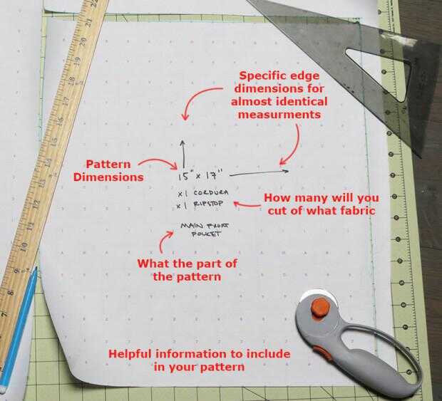 Algunos información útil siempre incluir en tus patrones. Puede ser fácil confundir el patron cuando son simplemente en blanco pedazos de papel todos aproximadamente del mismo tamaño. Marcando su patrón también le ahorrará la frustración de accidentalmente confundiendo a un patrón de papel de desecho y lanzándolo hacia fuera (yo he hecho muchas veces!)