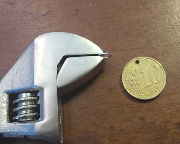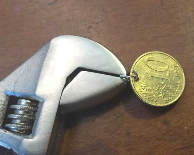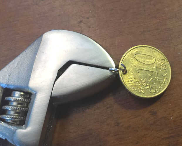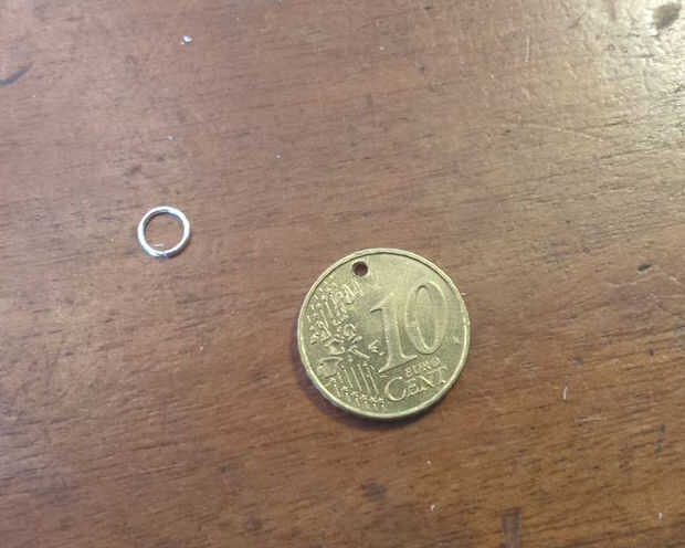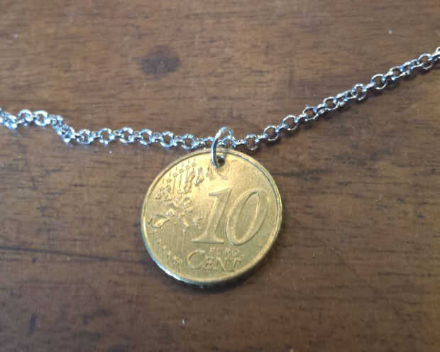 Usé mis alicates para abrir el anillo del salto y se deslizó la moneda en. (Jessyratfink tiene un estupendo tutorial sobre esto que usted puede encontrar aquí). Antes de cierre el anillo del salto que unido a la cadena puesto que el cierre de la cadena que consiguió era demasiado pequeño como para caber a través del anillo del salto después de que fue cerrado. Realmente quisiera que ya que eso significa que la moneda no se salga accidentalmente.